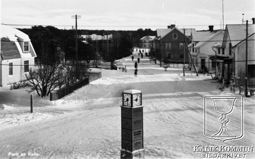 Till vänster skymtar huset som sedan byggdes om till bensinstationen IC (Bensinstationen=Inköps Centralen som senare bytte namn till OK= Oljekonsumenterna). När OK-stationen revs byggdes så ett nytt posthus på samma plats. Här finns idag en färgaffär.Till höger ser vi klädaffären Lidfelts med den speciella ingången på hörnet som kom att benämnas "Kalixhörn". I huset närmare i bild ser man skoaffären Oscaria och här hade även Alvar Fredriksson sin frisering.