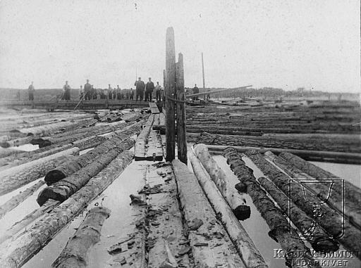 | Här sorteras allt virke upp mellarn olika ägare, vilket syns på stockarnas inhuggna bolagsmärken. Se även bild 143. Ur Arvid Taube:s fotosamling över resan han genomförde tillsammans med sin vän fotografen Hugo Salling. Bildarkivet tar gärna emot kompletterande information om bilden. |  |