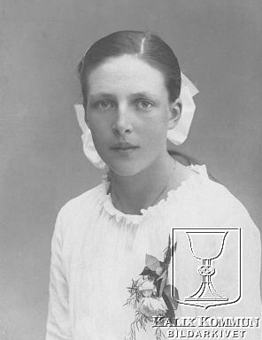 | Troligtvis är det konfirmation. Hon var dotter till urmakar Backman, vars hus fortfarande står kvar på Västra kyrkogårdsgatan 1. Själv tjänstgjorde hon i många år på Telegrafen i Kalix. Bilden ur Elin & Sven Landströms samling. Bildarkivet tar gärna emot kompletterande information om bilden. |  |