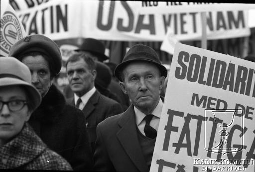 En typiskt traditionell bild av Svensk 1:maj demonstration. Där nationellt och internationellt viktiga frågor, just då proklameras. Många av banderollernas texter är faktiskt ganska tidlösa.
