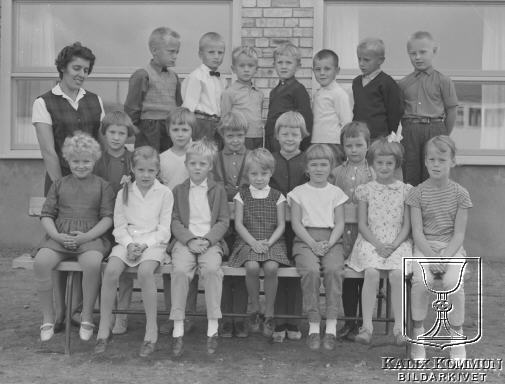 Lärarinnan till vänster är Karin Nordgren. Bakre fr.v. Folke Hammar, Sven Hedenberg, Dieter Reinisch, Nils Wester, Erik Lindberg, Gunnar Lindgren, Stefan Eriksson. Främre fr.v. Ann Gustavsson, Margot Hjälte, Eva Thorneus, Monika Hansson, Barbro Sandlund, Karin Lindström. |