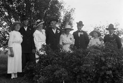 Under perioden mellan 1902 och 1918 byggdes järnvägen från Morjärv till Lappträsk - Karungi - Övertorneå och Haparanda. Dom människor som fotografen mötte under sitt arbete med järnvägen dokumenterade han gärna. Här ser vi fyra par som kanske råkade mötas tack vare järnvägsbygget. Eller kanske bara en sommarförälskelse? Bildarkivet tar gärna emot kompletterande uppgifter om motivet.