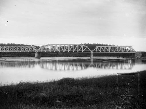 | Under perioden mellan 1902 och 1918 byggdes järnvägen från Morjärv till Lappträsk - Karungi - Övertorneå och Haparanda. En av dom många broar som byggdes i området. I Teknisk-Ekonomisk Redogörelse över Statsbanan Morjärv - Lappträsk och landsvägen Morjärv - Lappträsk (från 1912) står att denna bro är bron över Kalixälven i Morjärv med ett spann på 60,0 m fri spännvidd. Uppsatt av Motala Verkstads Nya Aktiebolag. Det står inte när bron färdigställdes. Man påbörjade grundläggningen i februari 1906 och när de båda broarna, järnvägsbron och landsvägsbron bara någon meter ifrån, var färdigställda hade de, i tidstypisk statstjänstemannanit, dragit en kostnad av 173.514 kronor och 78 öre. Motivet fångat norr om broarna. Bildarkivet tar gärna emot kompletterande uppgifter om motivet. |  |