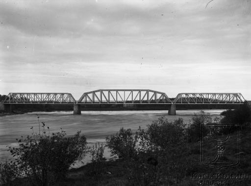 | Under perioden mellan 1902 och 1918 byggdes järnvägen från Morjärv till Lappträsk - Karungi - Övertorneå och Haparanda. En av dom många broar som byggdes i området. I Teknisk-Ekonomisk Redogörelse över Statsbanan Morjärv - Lappträsk och landsvägen Morjärv - Lappträsk (från 1912) står att denna bro är bron över Kalixälven i Morjärv med ett spann på 60,0 m fri spännvidd. Uppsatt av Motala Verkstads Nya Aktiebolag. Det står inte när bron färdigställdes. Man påbörjade grundläggningen i februari 1906 och när de båda broarna, järnvägsbron och landsvägsbron bara någon meter ifrån, var färdigställda hade de, i tidstypisk statstjänstemannanit, dragit en kostnad av 173.514 kronor och 78 öre. Motivet fångat norr om broarna. Bildarkivet tar gärna emot kompletterande uppgifter om motivet. |  |