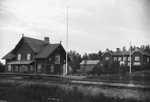 | Under perioden mellan 1902 och 1918 byggdes järnvägen från Morjärv till Lappträsk - Karungi - Övertorneå och Haparanda. Morjärvs nya järnvägsstation står klar. Järnvägshotellet är det stora huset till höger. Järnvägshotellet kom senare att bli FO67 första stab 1939-43. Det finns en minnestavla utanför huset som berättar om stabens verksamhet i Morjärv. Bildarkivet tar gärna emot kompletterande uppgifter om motivet. |  |