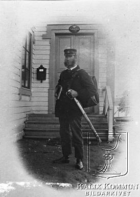 OBS! Bilden hämtad ur bildkollaget nr. 546. Under perioden mellan 1902 och 1918 byggdes järnvägen från Morjärv till Lappträsk - Karungi - Övertorneå och Haparanda. Postbudet på den här tiden bar sabel till skydd mot eventuella angripare. Dom färdades ofta till fots med post till byarna i bygderna runtomkring i tornedalen. Byggnaden i bakgrunden är den gamla skolan i Lappträsk. Troligtvis tjänstgjorde en del av huset som poststation på den här tiden. Bildarkivet tar gärna emot kompletterande uppgifter om motivet.