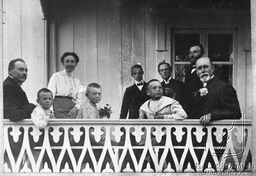 Under perioden mellan 1902 och 1918 byggdes järnvägen från Morjärv till Lappträsk - Karungi - Övertorneå och Haparanda. I dagsläget är okänt vilken ställning denna fotograf hade inom banverket, men det är uppenbart att han rörde sig lika obehindrat bland överklassen som bland vanligt folk. Här en familj som troligen har besök av någon prominent herre med blomma på bröstet. Bildarkivet tar gärna emot kompletterande uppgifter om motivet.