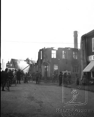 Åskådare har samlats när Åke Larsons järnaffär brinner. Bildarkivet tar gärna emot kompletterande information om bilden.