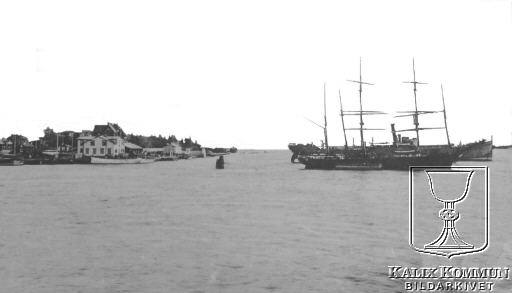 Fartyg uppankrade ute på redden, för lastning av virke från pråmar. Båten närmast i bild är en tremastad Bark som just lastar virke från pråmen som ligger vid sidan. Den bortre båten är ett ångfartyg. Bildarkivet tar gärna emot kompletterande information om bilden.