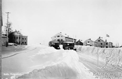 Ett vintermotiv från Kalix med mycket snö, precis som sig bör när det är vinter. På bilden ser man hur två bilar är på väg emot den första bron som byggts över Kalix älv.