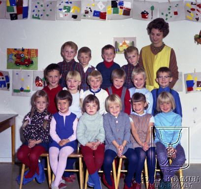 Bakre fr.v. Lasse Abrahamsson, Jan Johansson,?, Nisse Abrahamsson, fröken Rut Strömberg. Mellan fr.v. Jan Gustavsson, Ulla Lindbäck, Marianne Nilsson, Marlene Willberg, Lise-Lott Lund, Matts Johansson.. Främre fr.v. Lisa Wiklund, Anna-Karin Halmetkangas, Inger Andersson, Rose-Marie Henriksson,?, Anita Nilsson. Övriga okända. |