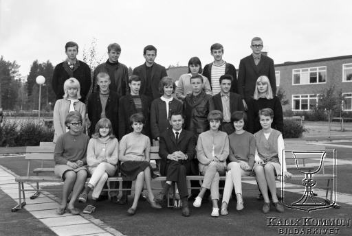 Bakre fr.v. Fred Broman, Hans Larsson, Anders Hedlund, Birgitta Persson, Bo Johansson och Ruben Engström. Mellan fr.v. Birgit Sandberg, Åke Eriksson, Jan Gramner, Karin Granberg, Jan-Erik Nilsson, Lars Öhlund, Lena Rösell. Främre fr.v. Hjördis Mörtberg, ?, Margareta Clausen, Ove Anttila, Anttila, Lilian ?, Gudrun Hansson, Marianne Grönberg I främre radens mitt sitter läraren Ove Anttila, övriga är okända. |