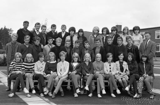 Bakre fr.v. Anders Dedering, Anders Öhman, Roland Bäckman, Tommy Sjöberg, Kjell Lindbäck, Barbro Karlsson, Eva Larsson, Inga-Lill Silver, Kristina Strömberg, Britt-Marie Andersson, Ing-Marie Sångberg, Else-Maj Mörk. Mellan fr.v. Benny Fahlen, Kjell Selberg, Roland andersson, Lars Bergström, Karl-Göran Fredriksson, Per Björkman, Benny Nilsson, Per-ola Bränvall, Erik Lojmorinnen, Gunnar Pettersson, Bengt Jacobsson, Torbjörn Strömbäck, läraren Lennart Tornberg. Främre fr.v. Kerstin Fredriksson, Lena Rönnqvist, Birgitta Lidman, Inger Mörsare, Anna-Greta Lundbäck, Pia Johansson, Berit Larsson, Gun Havela, Kerstin Johansson, Britt Sandlund, Eva Carlsson, Barbro Ekman. |