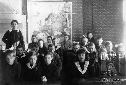 Lärarinnan är Signe Engström. Barkre raden nr. 3 från höger i rosett är Ingrid Björkman. Andra raden fr.v.: (pojke med mörkt hår) är Ingemar Björkman (från Vallen), nr 3 fr.v. är Åke Rönnkvist (från Vallen). Främre raden fr.h. nr 2 är Beda Fredriksson och nr 3 är Alice Björkman, övriga okända. |