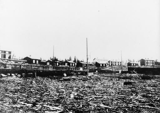 Arbetarbostäderna i Karlsborg på det s.k. Bomorådet som det en gång i tiden såg ut. Platsen ligger på östra sidan om viken där sågverket en gång låg. Bildarkivet tar gärna emot kompletterande information om bilden.