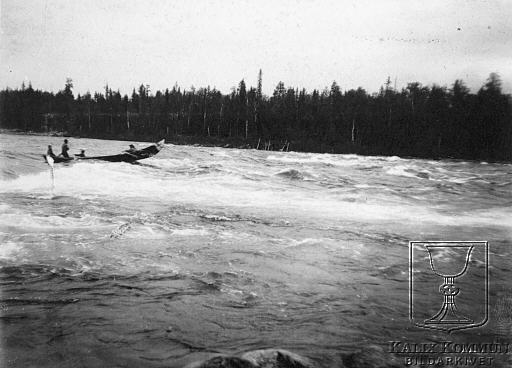 | Att ta sig igenom forsarna med "älvgädda" krävde stor skicklighet och erfarenhet, speciellt under vårperioden när vattenflödet var som störst. Ur Arvid Taube:s fotosamling över resan han genomförde tillsammans med sin vän fotografen Hugo Salling. Bildarkivet tar gärna emot kompletterande information om bilden. |  |