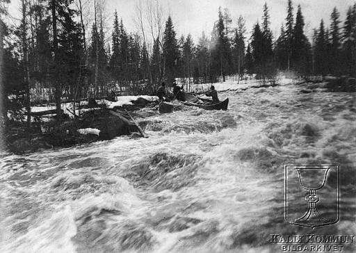 Här kämpar man sig fram genom forsarna vid Tärendö. Timmret är släppt och följer också med i älvfåran vilket gör att resan blir ännu mer riskfylld. Ur Arvid Taube:s fotosamling över resan han genomförde tillsammans med sin vän fotografen Hugo Salling. Bildarkivet tar gärna emot kompletterande information om bilden.