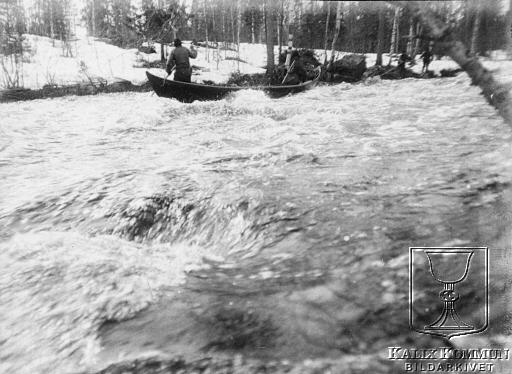 Här kämpar man sig fram genom forsarna vid Tärendö. Timmret är släppt och följer också med i älvfåran vilket gör att resan blir ännu mer riskfylld. Ur Arvid Taube:s fotosamling över resan han genomförde tillsammans med sin vän fotografen Hugo Salling. Bildarkivet tar gärna emot kompletterande information om bilden.