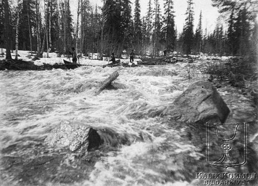 Här kämpar man sig fram genom forsarna vid Tärendö. Timmret är släppt och följer också med i älvfåran vilket gör att resan blir ännu mer riskfylld. Ur Arvid Taube:s fotosamling över resan han genomförde tillsammans med sin vän fotografen Hugo Salling. Bildarkivet tar gärna emot kompletterande information om bilden.
