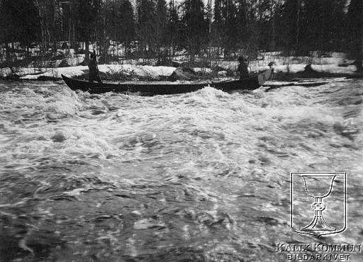 Här kämpar man sig fram genom forsarna vid Tärendö. Timmret är släppt och följer också med i älvfåran vilket gör att resan blir ännu mer riskfylld. Ur Arvid Taube:s fotosamling över resan han genomförde tillsammans med sin vän fotografen Hugo Salling. Bildarkivet tar gärna emot kompletterande information om bilden.