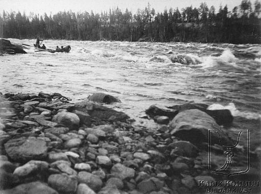 | Att ta sig igenom forsarna med "älvgädda" krävde stor skicklighet och erfarenhet, speciellt under vårperioden när vattenflödet var som störst. Ur Arvid Taube:s fotosamling över resan han genomförde tillsammans med sin vän fotografen Hugo Salling. Bildarkivet tar gärna emot kompletterande information om bilden. |  |