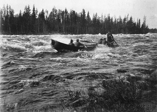| Att ta sig igenom forsarna med "älvgädda" krävde stor skicklighet och erfarenhet, speciellt under vårperioden när vattenflödet var som störst. Ur Arvid Taube:s fotosamling över resan han genomförde tillsammans med sin vän fotografen Hugo Salling. Bildarkivet tar gärna emot kompletterande information om bilden. |  |