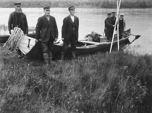 | Ur Arvid Taube:s fotosamling över resan han genomförde tillsammans med sin vän fotografen Hugo Salling. Här ser vi dom män som ansvarade för resan med Arvid Taube och Holger Salling utefter Kalix älvdal genom forsar och fall , från Kirunavaara till kusten. Bildarkivet tar gärna emot kompletterande information om bilden. |  |