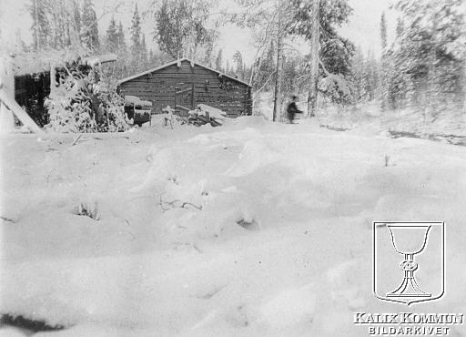 Det kan vara en skogsarbetarkoja, men det är osäker då den saknar skorsten. Ur Arvid Taube:s fotosamling över resan han genomförde tillsammans med sin vän fotografen Hugo Salling. Bildarkivet tar gärna emot kompletterande information om bilden.