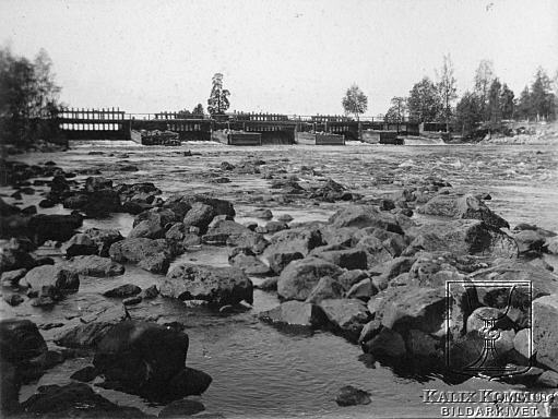 | Flottningen i Kalix älv har varit av största betydelse för skogsindustrin, långt in i vår tid. Med hjälp av dom många dammar som byggdes, i dom små biflödena till Kalix älv, reglerades vattennivån så att virket utan hinder kunde flottas ut till huvudälven. Ur Arvid Taube:s fotosamling över resan han genomförde tillsammans med sin vän fotografen Hugo Salling. Bildarkivet tar gärna emot kompletterande information om bilden. |  |