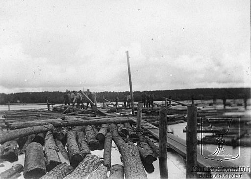 | Här sorteras allt virke upp mellarn olika ägare, vilket syns på stockarnas inhuggna bolagsmärken. Se även bild 143. Ur Arvid Taube:s fotosamling över resan han genomförde tillsammans med sin vän fotografen Hugo Salling. Bildarkivet tar gärna emot kompletterande information om bilden. |  |