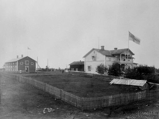 Huset var förvaltarbostad för Nyborgs sågverk under Bergman & Hummels tid. Med tanke på att unionsflaggan är hissad så måste fotot vara taget senast år 1905. Efter sågens nedläggning år 1901 inrättades i huset till vänster en av Nyborgs största skolor. Själva herrgårdsbyggnaden blev då lärarbostad på övre planet med matsal och gymnastiksal på nedre plan. I huset som skymtar bakom herrgården fanns även lokal för träslöjd. Skolan lades ned i början av 1960-talet. Bildarkivet tar gärna emot kompletterande information om bilden. |  |