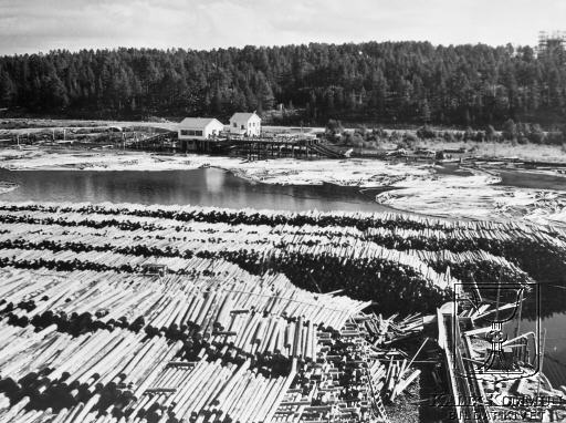 Timmer upplag med barkamaskinhuset på andra sidan viken.