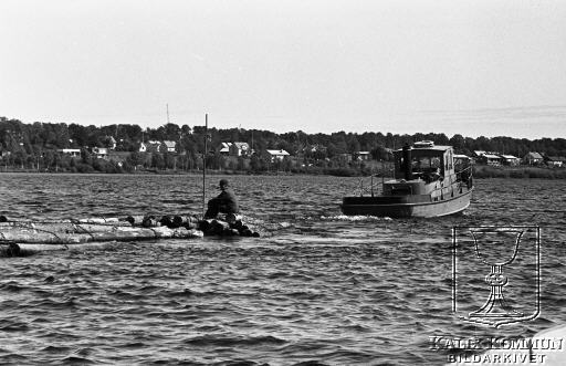 Här är en av mindre bogserbåtarna på väg från Vassholmens skiljeställe med timmerflottar för avlämning vid något av dom många havsflottningsverk som låg placerade ute vid kusten. Att sitta på lasset och få en stunds vila kunde vara ganska trevligt i sommarsolen.