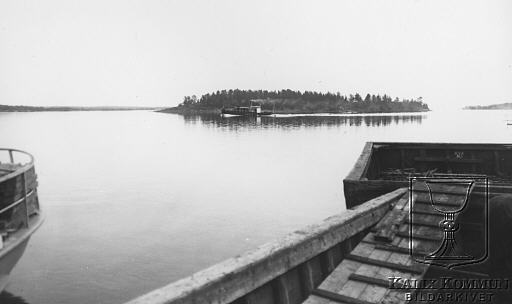 I bakgrunden ser man ångbåten "Kalix" som är på väg mot Kalix kaj. Till vänster i bild skymtar bogserbåten "Arvid" som är på väg att transportera hästar till sommarbete med pråmen som skymtar till höger i bild. Bilden ur Filipsborgs fotosamling. Bildarkivet tar gärna emot kompletterande information om bilden.