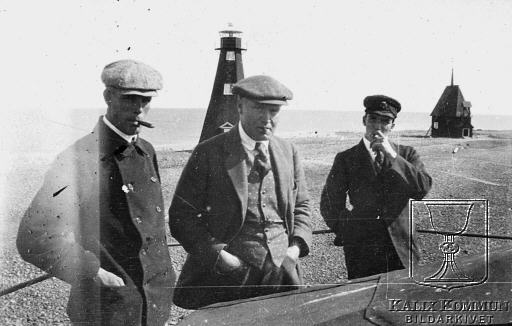 Männen står uppe på den 12 meter höga utbyggnad på fyrbyggnaden där det tidigare fanns en lanternin, en typ av torn med fönster som kröner ett tak eller kupol. Bilden ur Filipsborgs fotosamling. Bildarkivet tar gärna emot kompletterande information om bilden.