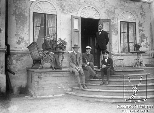 | Här ser man familjen Bergman på trappan till Grytnäs herrgård. Lägg märke till det mycket intressanrta med denna bild, nämligen att herrgården på den här tiden hade en fasad av murbruk / puts. För att fästa putsen på den timrade byggnaden monterades ett nät av ribbor som armerade putsen. Fasdtypen gav möjlighet att ge en helt annan karaktär åt byggnaden, inte minst ser man det ovanför fönster och dörrar. Bilden ur Filipsborgs fotosamling. Bildarkivet tar gärna emot kompletterande information om bilden. |  |