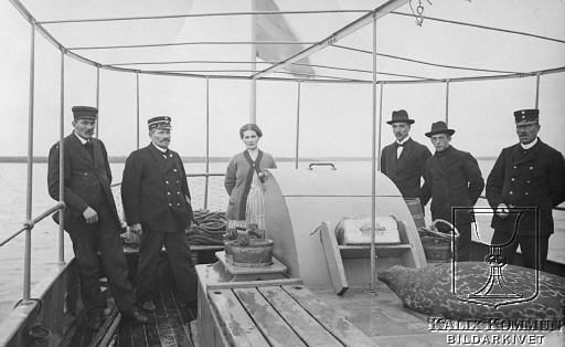 Tullöveruppsyningsmannen Theodor Johansson från byn Lappbäcken utanför Kalix, poserar här tillsammans med några gäster på tyllkryssaren "Gripens" akterdäck efter att besättningen just skjutit en säl som man här visar upp. Ur Torborg Lindgrens fotosamling. Bildarkivet tar gärna emot kompletterande information om bilden.