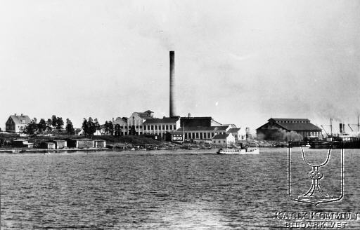 Den nya sulfatfabriken från sjösidan. På den här tiden hette sågverket på Karlsborg "Baltiska Trävaru AB". Huvudägaren var Marcus Wallenberg. År 1913 fattades beslutet om att på platsen bygga denna sulfatfabrik. Precis när fabriken var färdig att tas i bruk startade första världskriget. En förödande situation för hela svenska näringslivet, inte minst för detta bruk. Driften lades ned redan under år 1918. Maskinerna såldes till Finland strax efter krigsslutet. |  |
