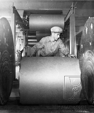 Här i packsalen får varje rulle ett skyddande emballage innan leverans till det stora pappersmagasinet, i väntan på transport ut till kund. I den stora "gavelpressen" limmas ett runt gavelemballage. I dag rullas inget för hand som här på bilden.
