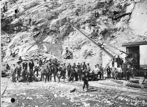 | Under perioden mellan 1902 och 1918 byggdes järnvägen från Morjärv till Lappträsk - Karungi - Övertorneå och Haparanda. Här ser man järnvägsrallarna i färd med att bryta berg för att få fram järnbanan. Var exakt fotot är taget är helt okänt för bildarkivet. Bildarkivet tar gärna emot kompletterande uppgifter om motivet. |  |