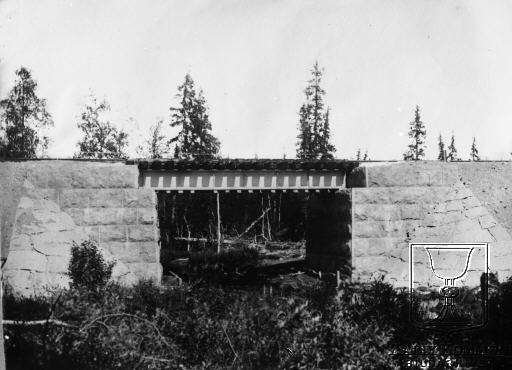 | Under perioden mellan 1902 och 1918 byggdes järnvägen från Morjärv till Lappträsk - Karungi - Övertorneå och Haparanda. I Teknisk - Ekonomisk Redogörelse för anläggandet av Statsbanan Morjärv - Lappträsk (från 1912) finns två alternativ till denna bro, då inget av alternativen redovisas med fotografi. Båda broarna har nämligen samma spännvidder, 6,o m och är i övrigt i stort sett likadana. Alternativen är bron över Tomasmyrbäcken eller över Flakaträskbäcken. Kostnaderna var för Tomasmyrbäcken 11.159 kronor och 14 öre samt för Flakaträskbäcken 20.538 kronor och 29 öre. Bron över Flakaträskbäcken fördyrades avsevärt gentemot den likadana över Tomasmyrbäcken på grund av sämre grundläggningsförhållanden. Bildarkivet tar gärna emot kompletterande uppgifter om motivet. |  |