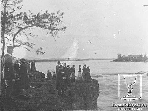 | OBS! Bilden hämtad ur bildkollaget nr. 546. Under perioden mellan 1902 och 1918 byggdes järnvägen från Morjärv till Lappträsk - Karungi - Övertorneå och Haparanda. Här har människor samlats för ett festligare möte, kanske är det midsommarnatt vid torne älv? Bildarkivet tar gärna emot kompletterande uppgifter om motivet. |  |