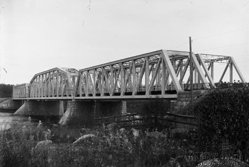 | Under perioden mellan 1902 och 1918 byggdes järnvägen från Morjärv till Lappträsk - Karungi - Övertorneå och Haparanda. En av dom många broar som byggdes i området. I Teknisk-Ekonomisk Redogörelse över Statsbanan Morjärv - Lappträsk och landsvägen Morjärv - Lappträsk (från 1912) står att denna bro är bron över Kalixälven i Morjärv med ett spann på 60,0 m fri spännvidd. Uppsatt av Motala Verkstads Nya Aktiebolag. Det står inte när bron färdigställdes. Man påbörjade grundläggningen i februari 1906 och när de båda broarna, järnvägsbron och landsvägsbron bara någon meter ifrån, var färdigställda hade de, i tidstypisk statstjänstemannanit, dragit en kostnad av 173.514 kronor och 78 öre. Motivet fångat norr om broarna. Bildarkivet tar gärna emot kompletterande uppgifter om motivet. |  |