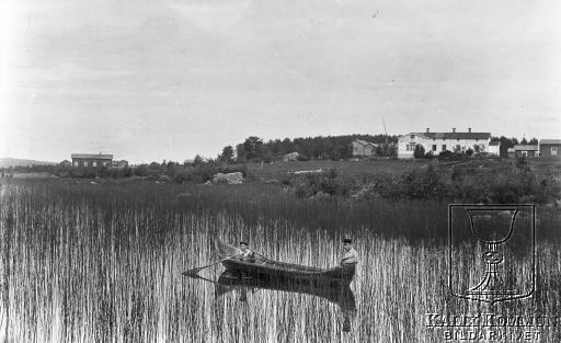 | Under perioden mellan 1902 och 1918 byggdes järnvägen från Morjärv till Lappträsk - Karungi - Övertorneå och Haparanda. Bilden är från Lappträsk. Lappträsket med skolan i bakgrunden, den vita byggnaden alltså. Englunds till vänster vid vattnet. Bakom skolbyggnaden Edgard Erikssons. |  |