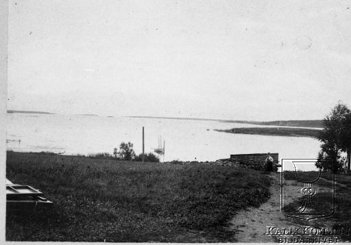 | Är väldigt osäker. Men detta motiv ser ut att vara taget vid Kalixälvens östra älvstrand intill ön Fisket, med utsikt över havet längst bort och byn Vallen ( den bortre stranden till höger i bild ). En gång i tiden var Fisket helt kalt. All den skog som sedan vuxit upp är planterad under 1900-talets början. Den kala ön till höger skulle i så fall vara den södra delen av ön. Bildarkivet tar gärna emot kompletterande uppgifter om motivet. |  |
