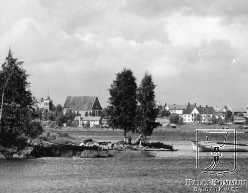 Bild över Nederkalix samhälle från andra sidan stranden vid Grytnäs. På bilden ser man gamla Grapes hus som fortfarande står kvar, samt tvättstugan nedanför kyrkan. Bildarkivet tar gärna emot kompletterande information om bilden. |  |