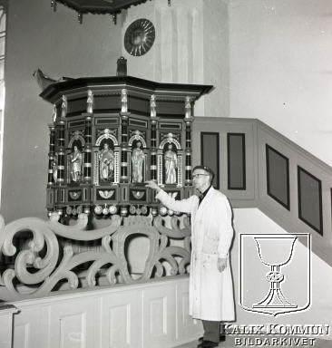 Restaurering av kyrkan genomfördes av konservator Fridtiof Erichson. Bildarkivet tar gärna emot kompletterande information om bilden.