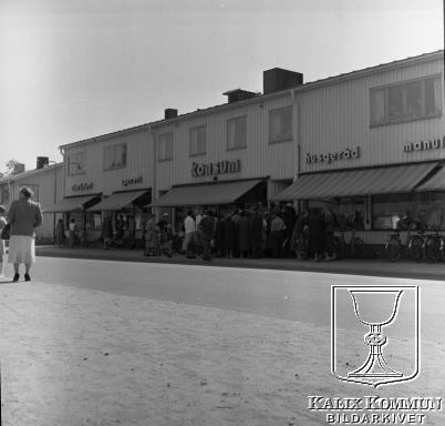 Det är realisation på Konsum vid Köpmannagatan 12. Stans kvinnor tycks ha mobiliserat, eftersom kön sträcker sig ut på gatan. Bildarkivet tar gärna emot komplettterande information om bilden.