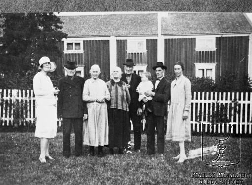 Fr.v. Tora Lindberg, f. Ekman, lärarinna i byn, Johan Jakob Gahm (1855-1930) med hustrun Dorotea, f. Groth (1855-1934), Lars Albert Larsson (1856-) med hustrun Josefina, f. Larsdotter (1855-), boende i grannbyn Stora Lappträsk, Axel Gahm (1892-) med hustrun Selin, f. Sandberg (1899-) och dottern Maj-Britt (1928-). Personerna är fotograferade framför Axel Gahms gård. Byns äldsta gård. ( Gahm:s ). Den minsta ( en flicka ) är 5:e generationen Gahm. Bildarkivet tar gärna emot komplettterande information om bilden.