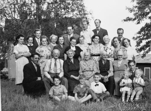 Stående fr v: Gerd Johansson (f Eriksson), Greta Johansson (f Wikström), Bert Johansson, Helga Rönnbäck, Greta Isaksson (f Johansson), Rut Englund (f Åberg), Bengt Englund, Ingrid Nilsson (f Johansson), Ingeborg Sandberg (f Johansson), Artur Nilsson, Augusta Oberg,Erik Åberg, Hilda Oberg, karin Åberg, Sten Karlsson, Beda Karlsson